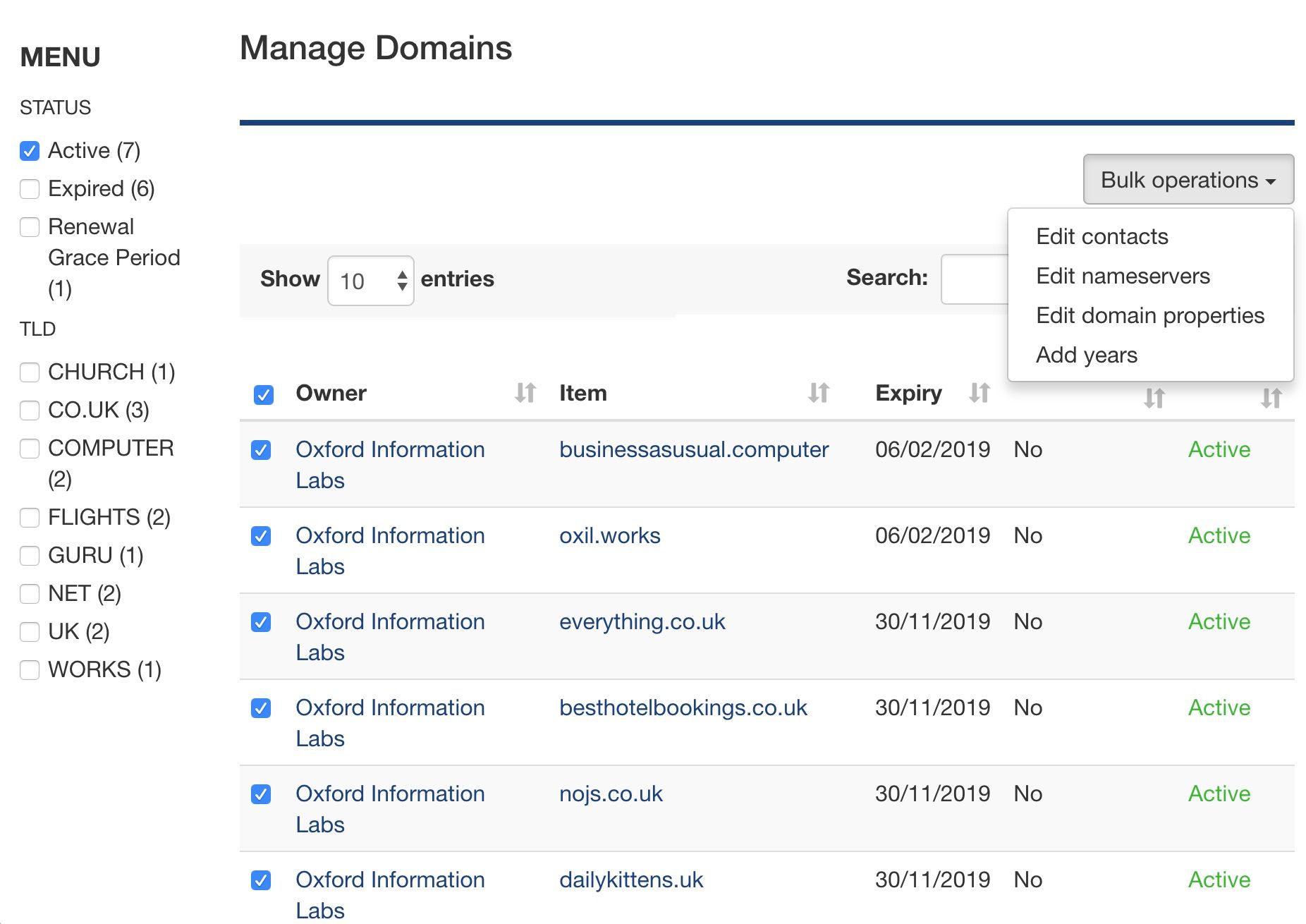 Select domain names by status, owner, top-level domain, tag and more. You can perform buik operations on domains selected.
