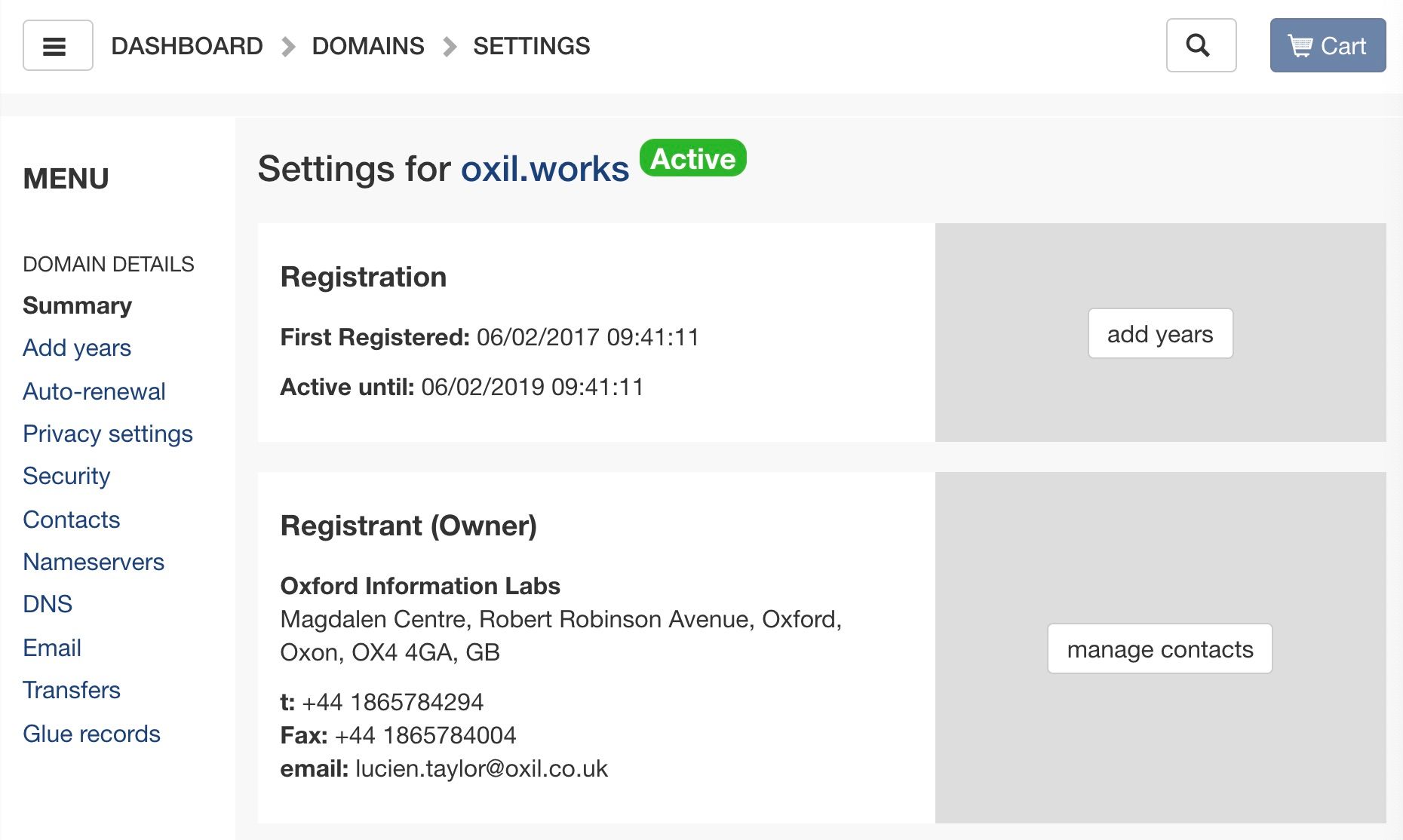 Manage all aspects of a domain from a properties summary screen.